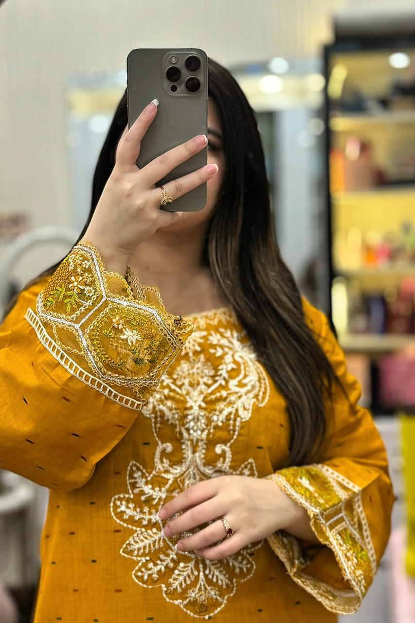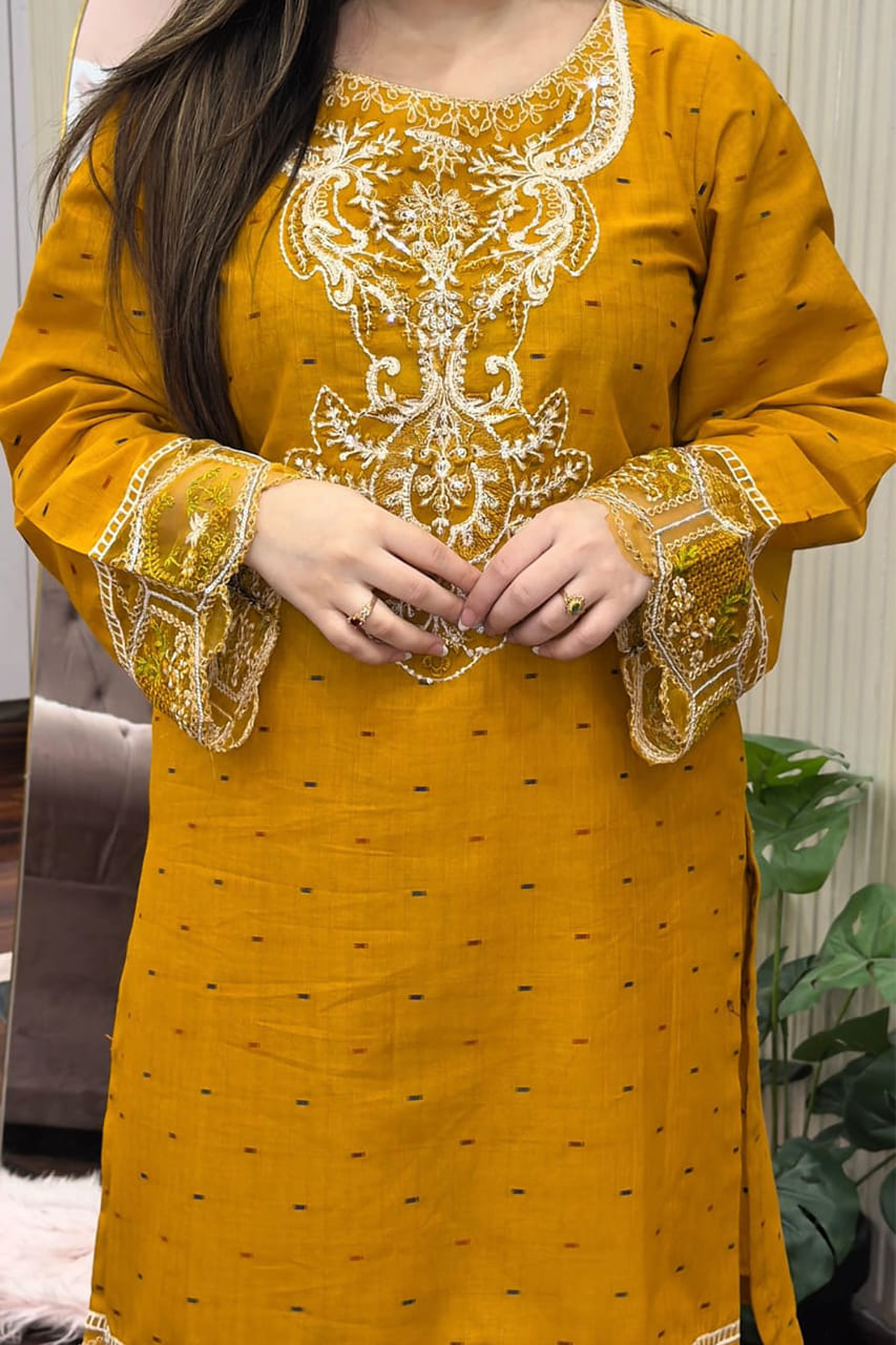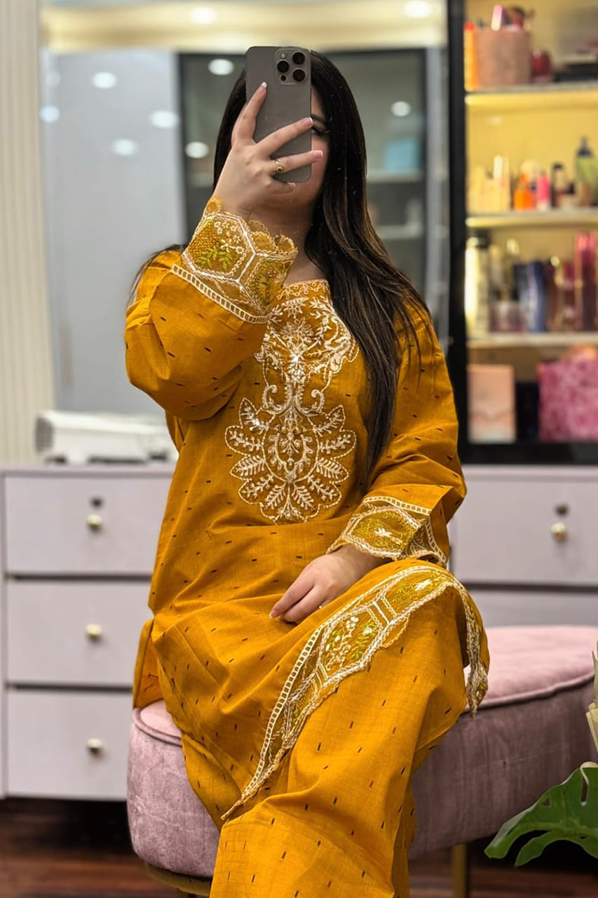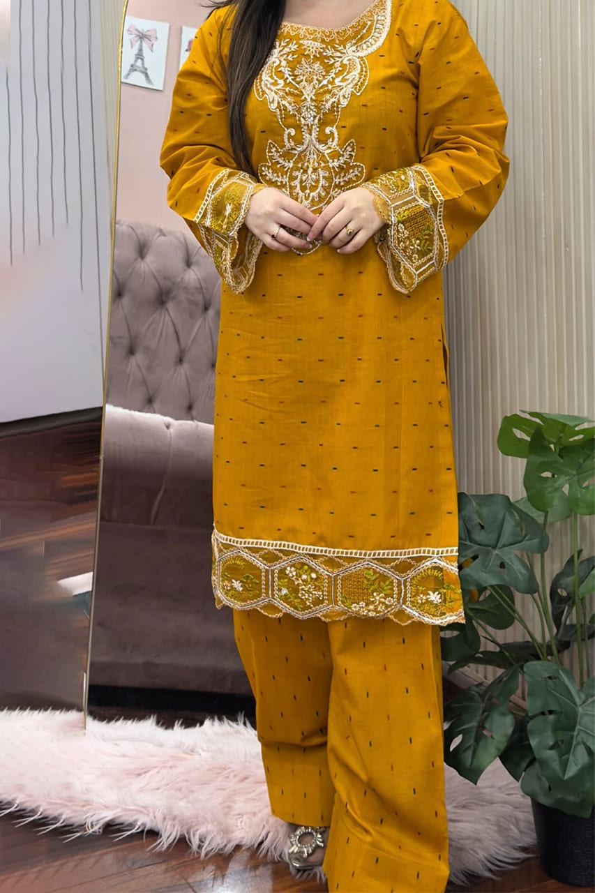 Muqaddas Embroidered 2PC is a summer cotton outfit made from brand fabric. This stitched set features an embroidered kurta paired with a farshi salwar, designed for a traditional yet comfortable look.