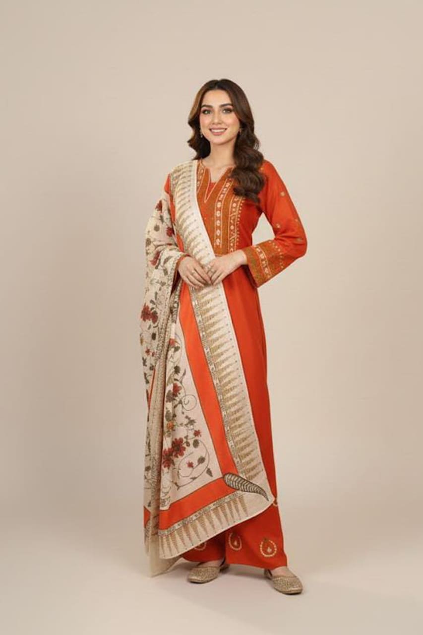 This premium linen embroidered outfit is crafted using brand fabric, featuring detailed embroidery on the shirt and plazo for a refined stitched look.