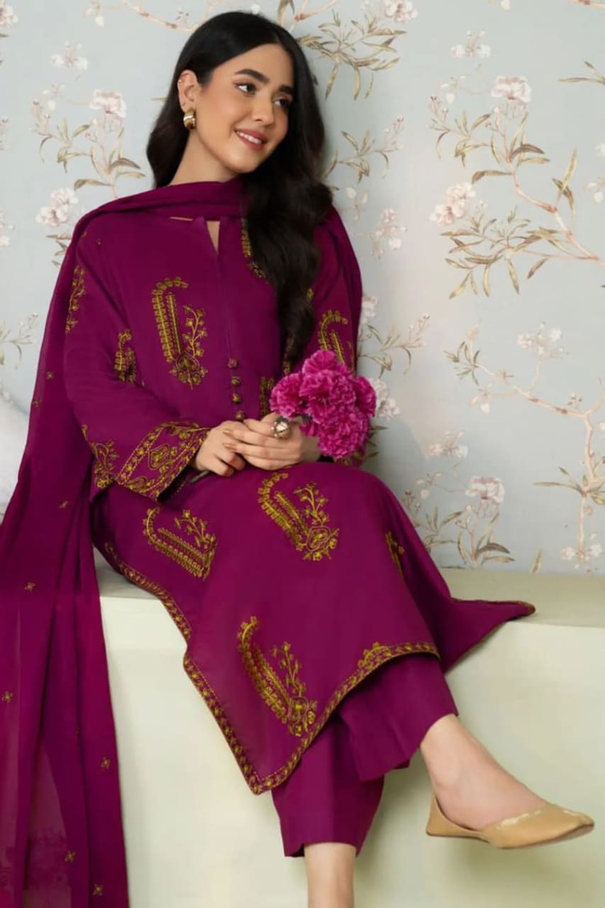 This outfit is stitched in Premium Stone Linen brand fabric, featuring an embroidered shirt paired with a plain trouser. It follows a simple, elegant, and highly demanded style.