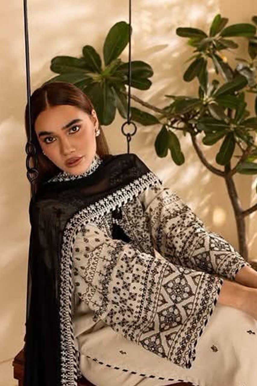 This is a stone linen embroidered long length suit made with branded stone linen fabric. The shirt features embroidery, paired with an embroidered trouser and an embroidered dupatta, designed for a complete coordinated look.