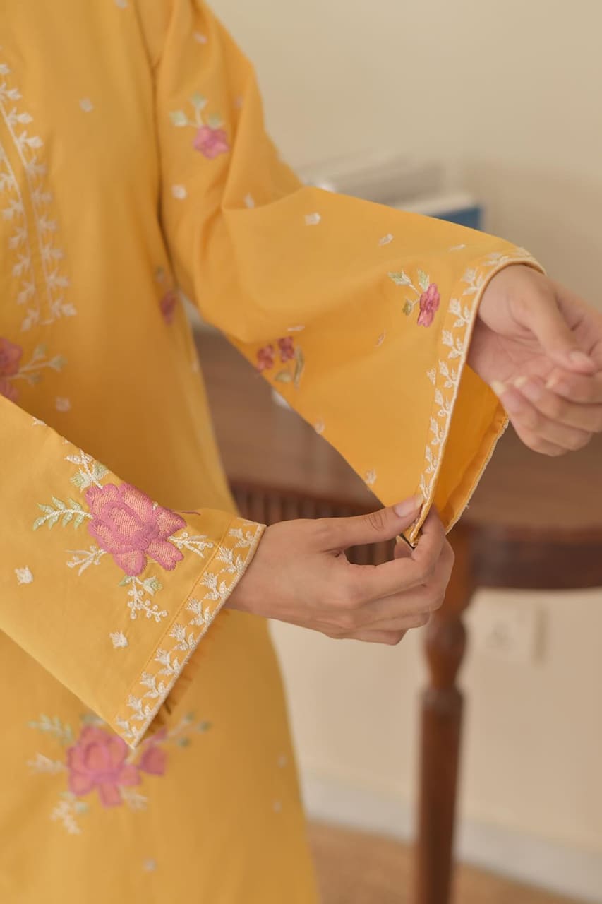 This is a 3 piece stitched outfit made from Stone Linen brand fabric. The set features an embroidered linen shirt paired with a matching farshi salwar and a digital dupatta, making it a highly demanded article.